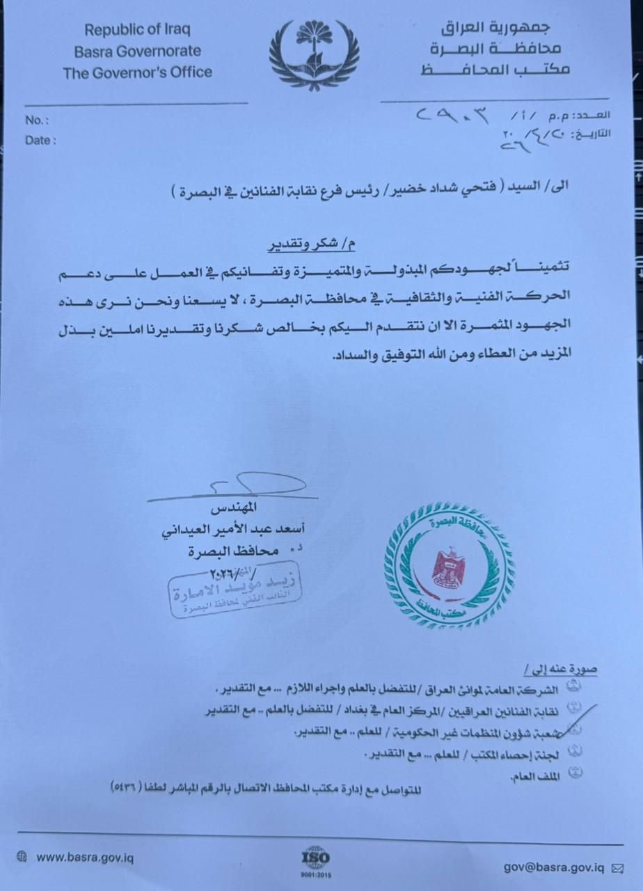 ابارك للاخ والصديق العزيز الاستاذ فتحي شداد رئيس نقابة الفنانين العراقيين فرع البصرة على تكريمه المستحق من قبل السيد محافظ البصرة الاستاذ اسعد العيداني المحترم والسيد نائب رئيس مجلس المحافظة الاستاذ اسامة السعد المحترم… .