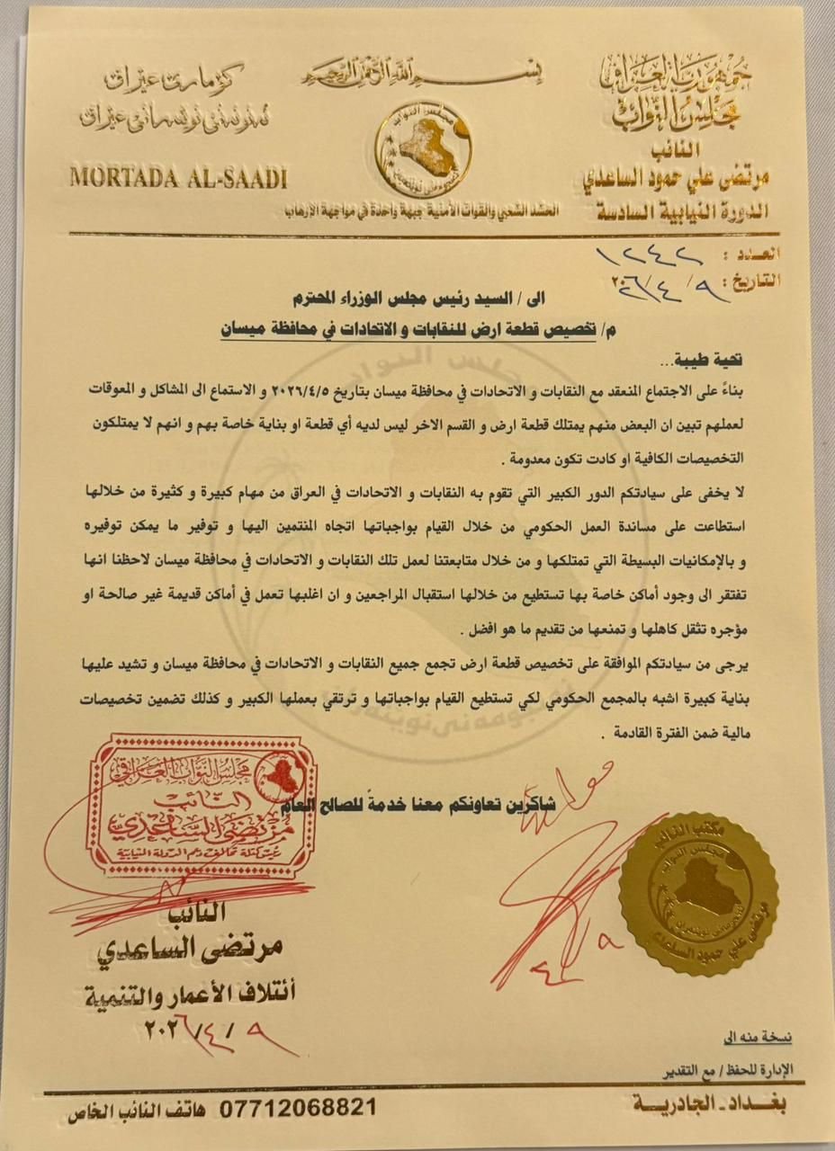 أعلن النائب مرتضى الساعدي، اليوم، عن حصوله على موافقة رئيس مجلس الوزراء لتخصيص قطعة أرض في محافظة ميسان، وذلك لغرض إنشاء مجمع متكامل يضم مختلف النقابات والاتحادات المهنية.
