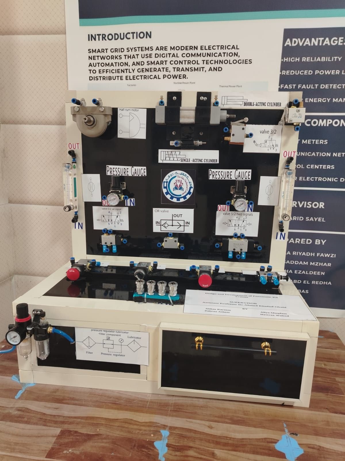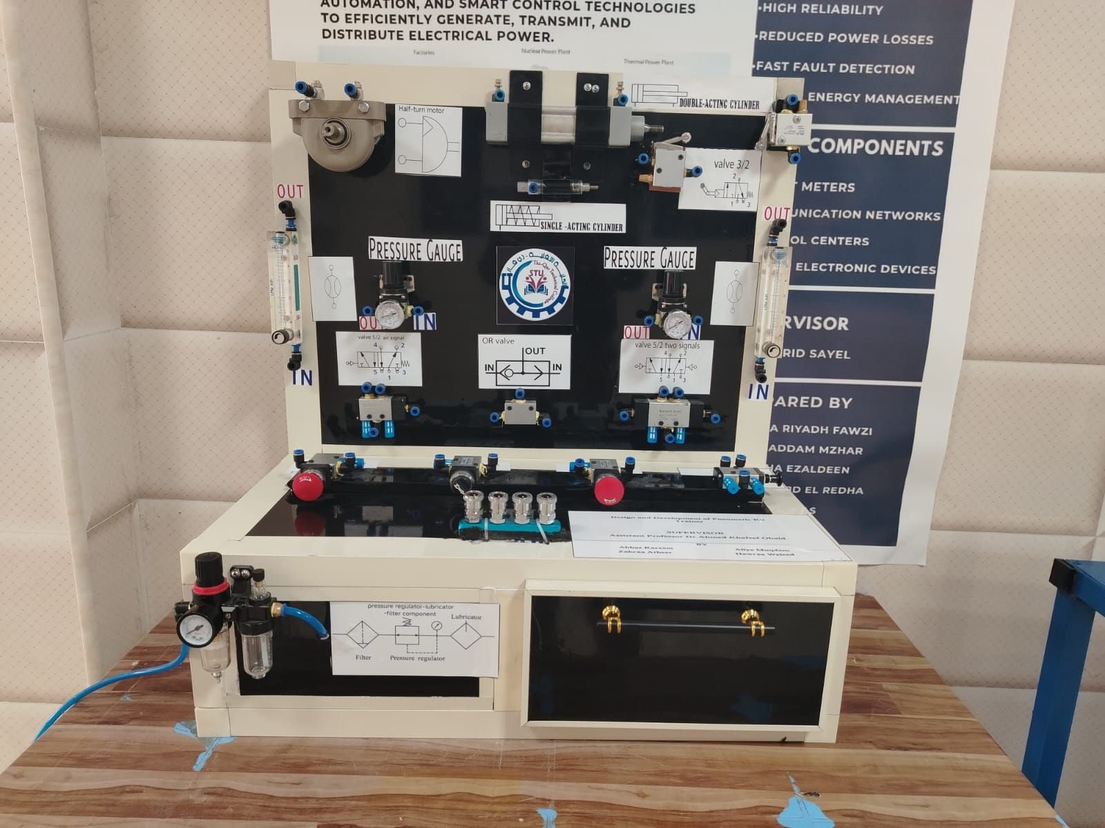 واستطرد إلى أن”جهاز بورد تجارب الانظمة النيوماتيكية هو نتاج لمشروع تخرج طلبة من المرحلة الرابعة في قسم هندسة تقنيات النظم الكهروميكانيكية وهو بورد مختبري من الممكن استخدامه في مختبرات مادة الأجهزة الكهروميكانيكية ومادة قدرة الموائع وبالأخص الأنظمة النيوماتيكية حيث يتيح أجراء أكثر من 14 تجربة لمحاكاة دوائر نيوماتيكية مختلفة وتضمين عدد واسع من عناصر هذه الدوائر بما يضمن تحقيق المعرفة لدى الطلبة حول مبدا عمل كل عنصر وتقييم أداء الدائرة النيوماتيكية المختلفة