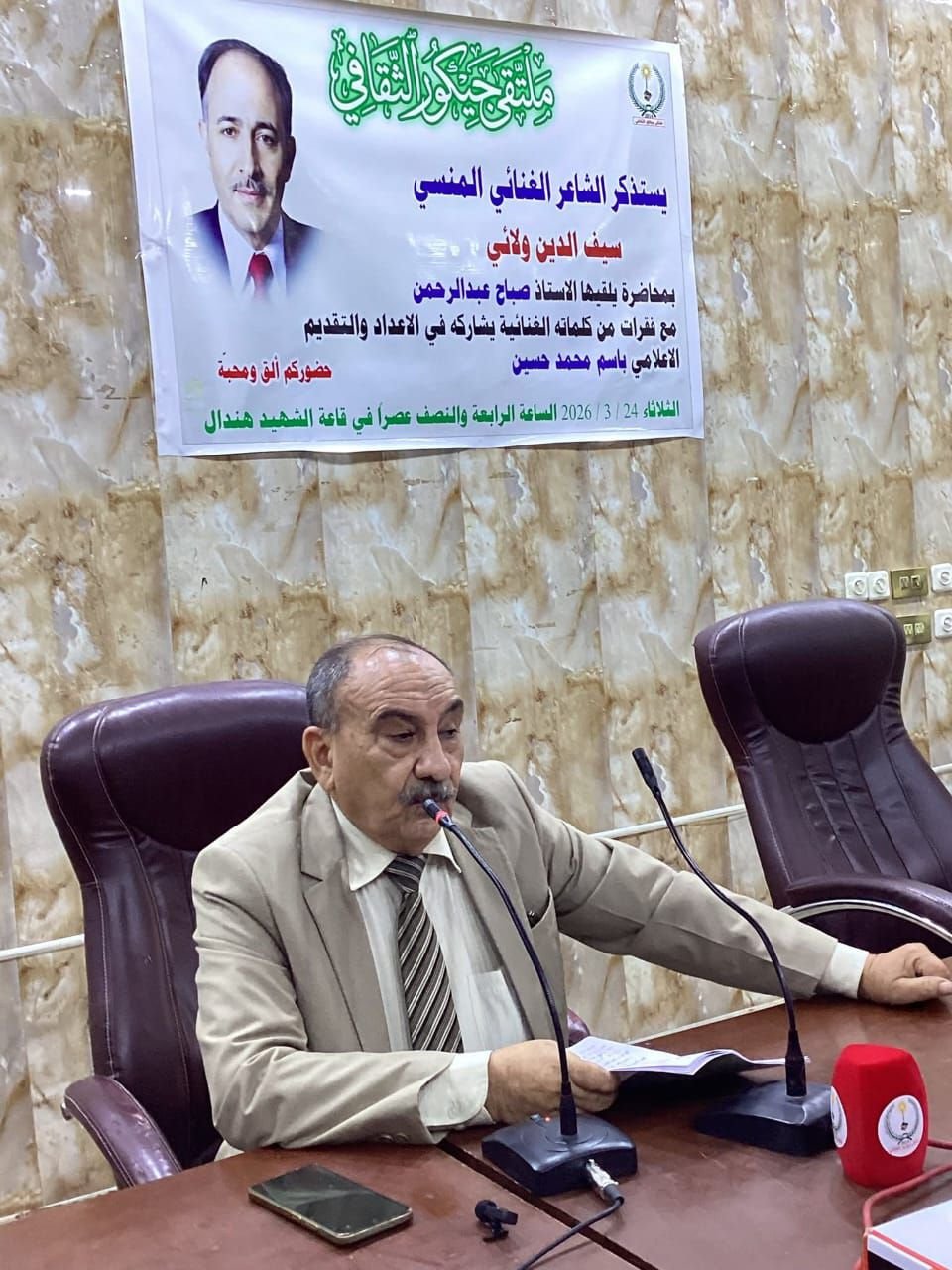 احتضنت قاعة الشهيد هندال في مقر محلية البصرة للحزب الشيوعي العراقي هذا اليوم الجلسة الثقافية والفنية لاستذكار الشاعر الغنائي سيف الدين ولائي وقد حضر الجلسة نخبة من الادباء والشعراء والفنانين ، حيث القى المحاضر الاستاذ صباح عبدالرحمن محاضرة استذمر فيها حياة واعمال الشاعر الغنائي المنسي صاحب كلمات الالف اغنية ( سيف الدين ولائي) وتناول محطات متعددة من حياته واهم اعماله الغنائية التي اضافت الى المكتبة الغنائية اهم الاغاني واعذبها .. وقد قدم الجلسة الاعلامي الاستاذ باسم محمد حسين ،وبعد حديث المحاضر صباح والاغنيات التي عرضها باسم شارك عدد من الحاضرين بمداخلات اغنت الجلسة التي تعتبر من الجلسات المتميزة.…